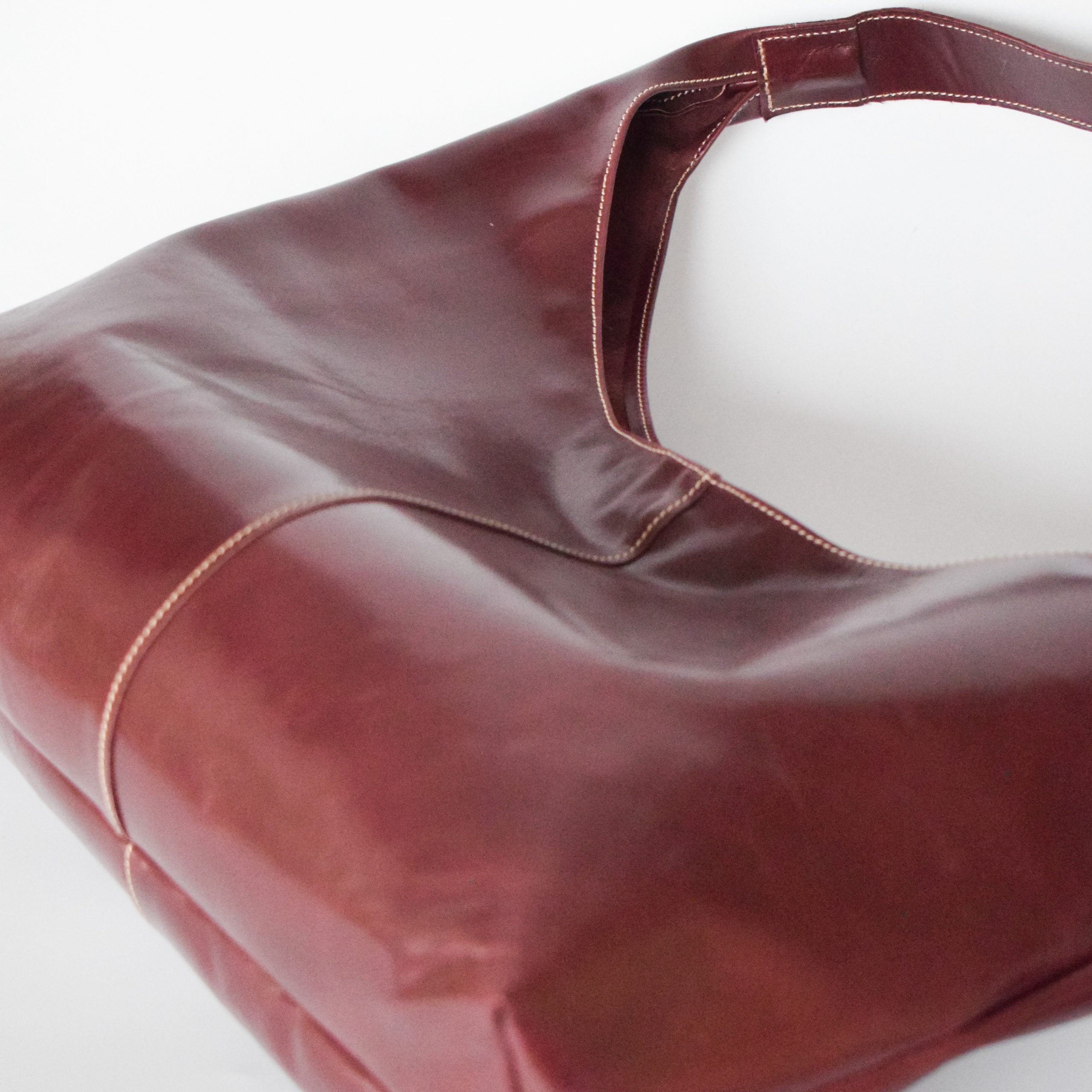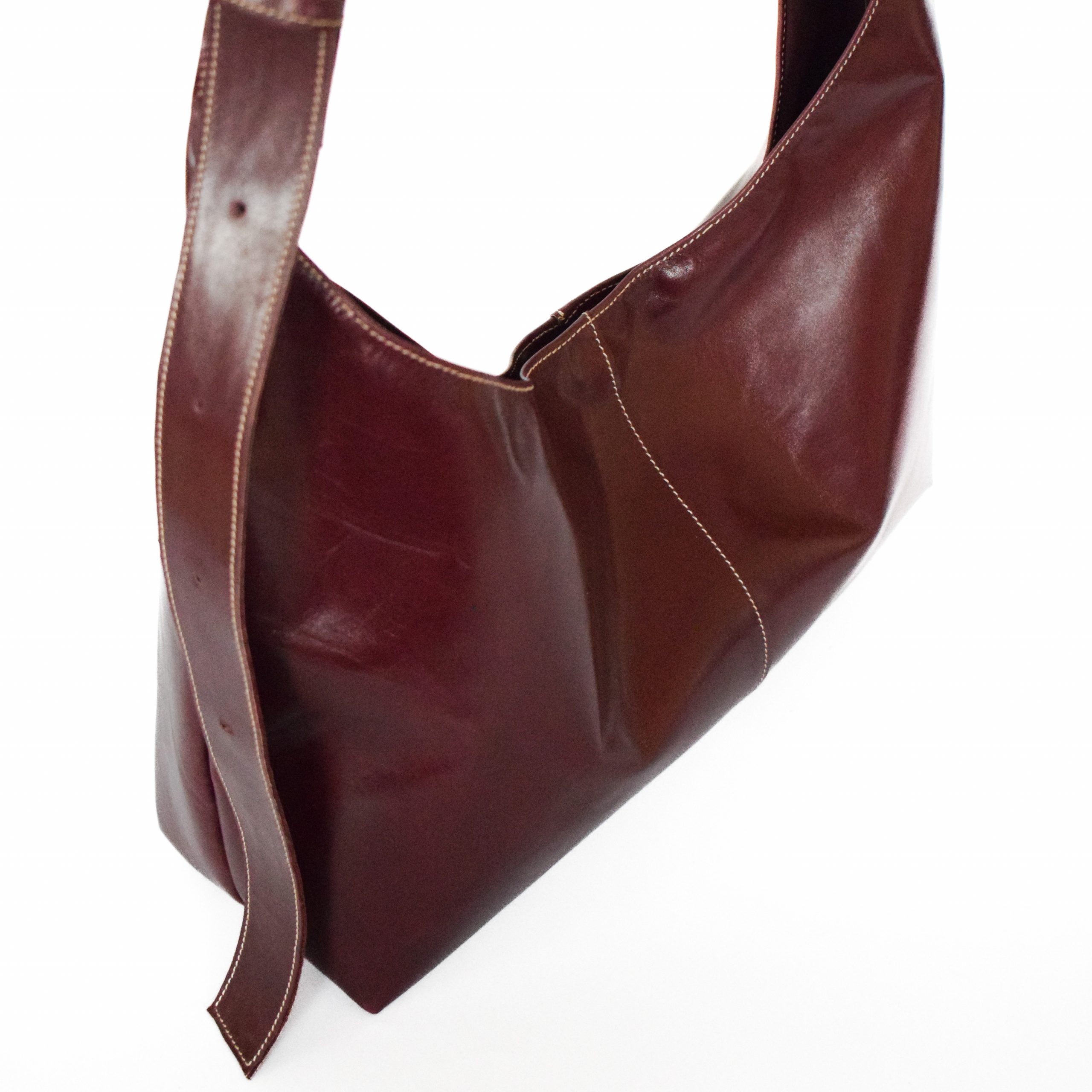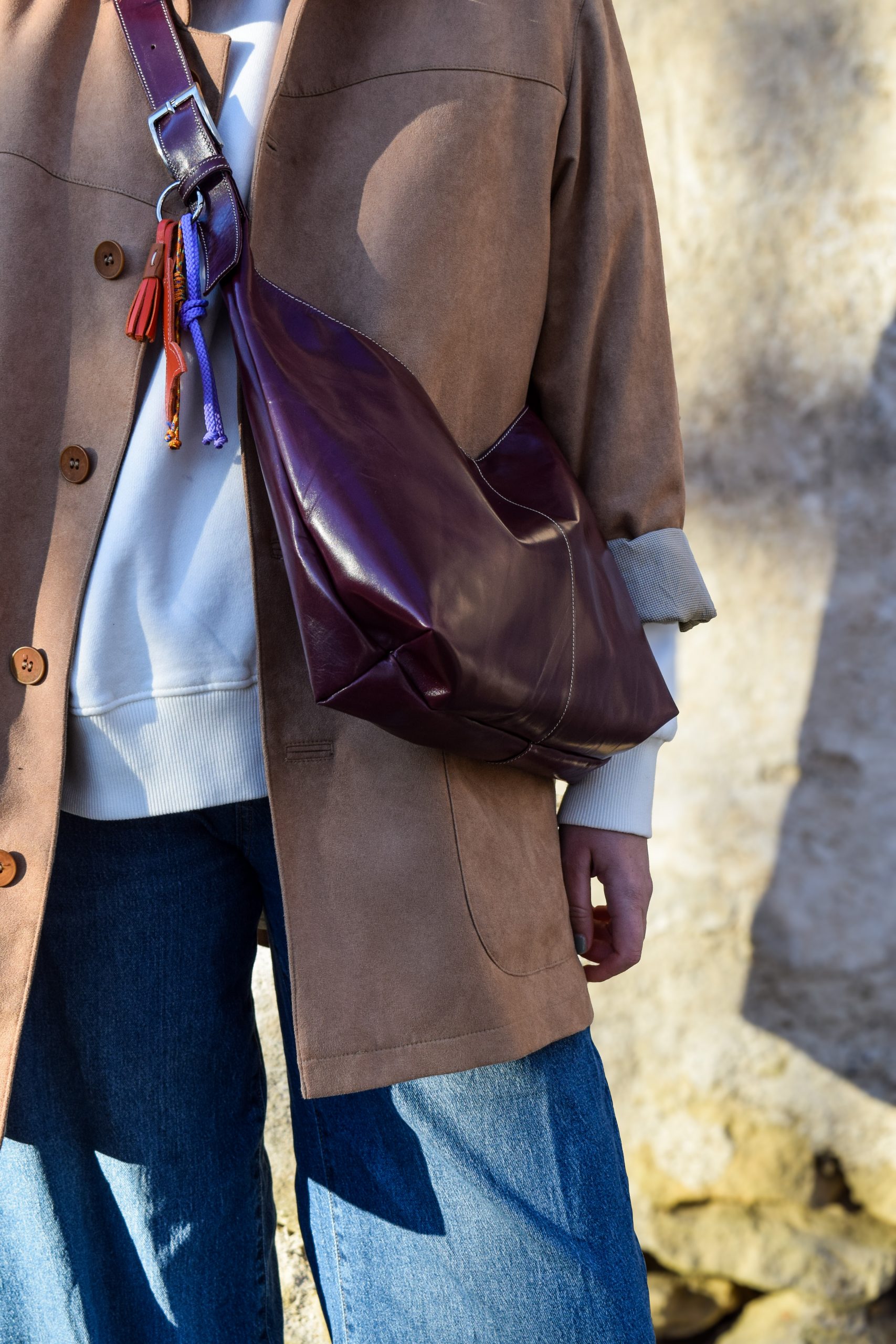 Découvrez Mona, un sac en cuir bordeaux vernis, élégant et pratique, entièrement réalisé à la main dans mon atelier à Aigues-Vives, dans le Gard.