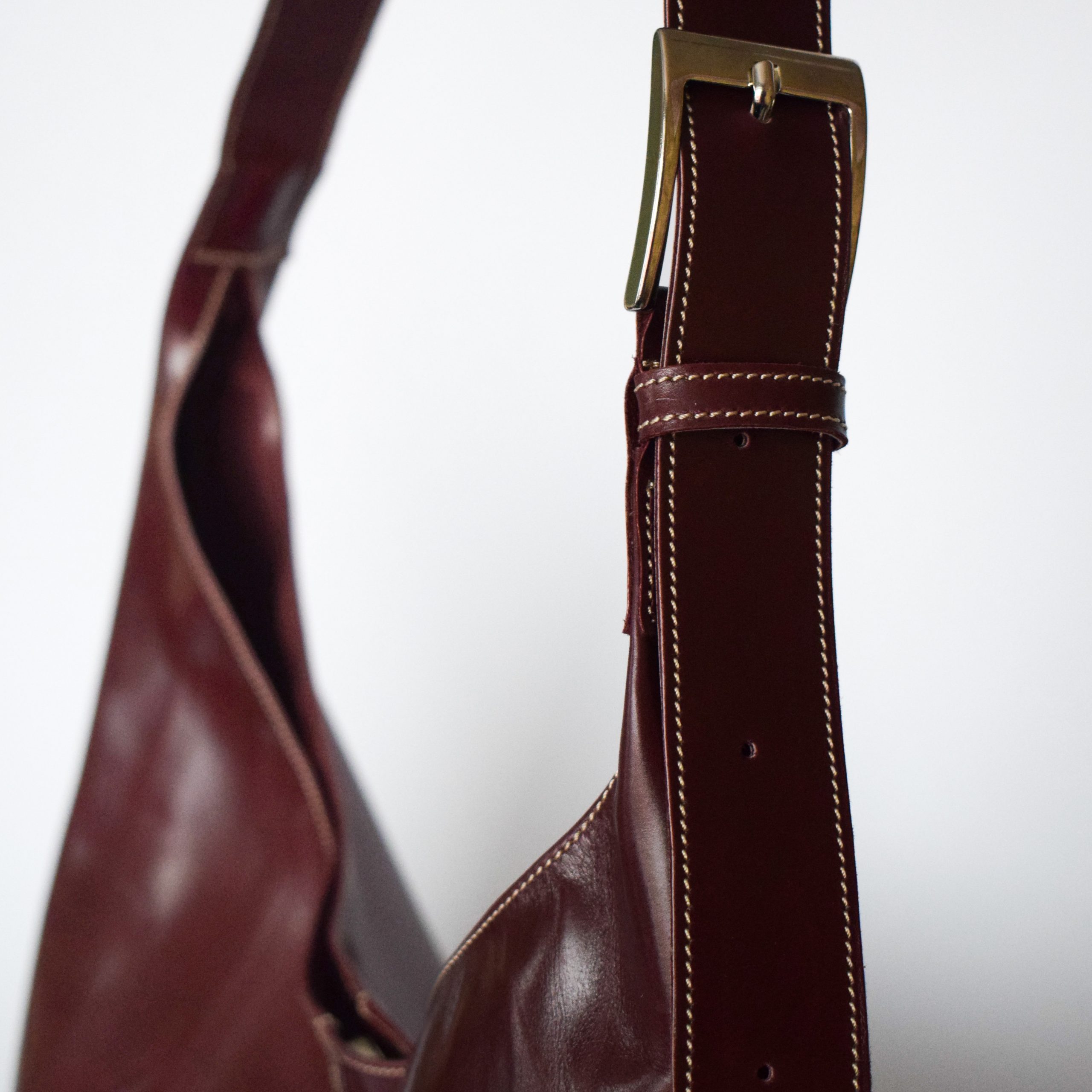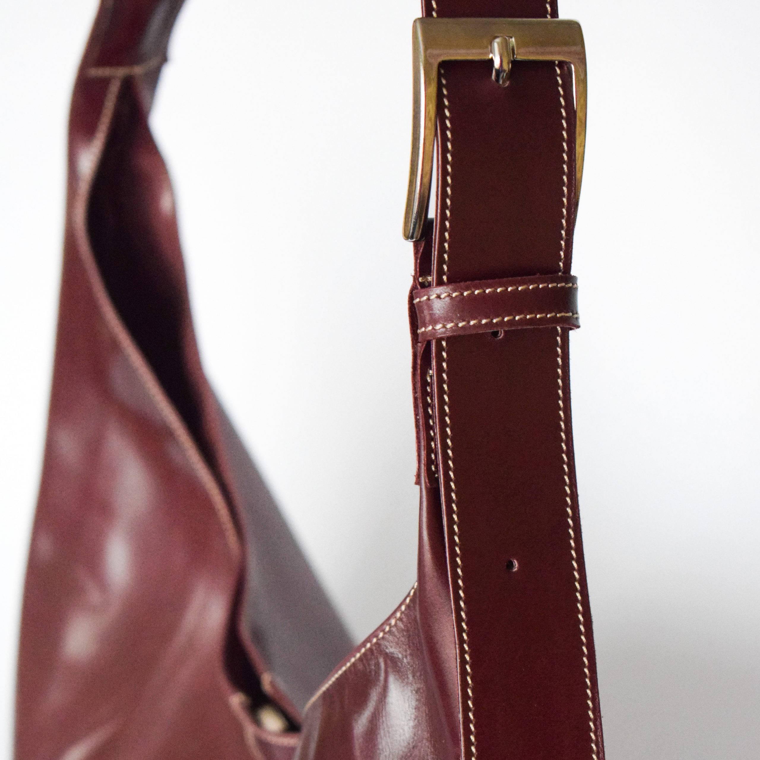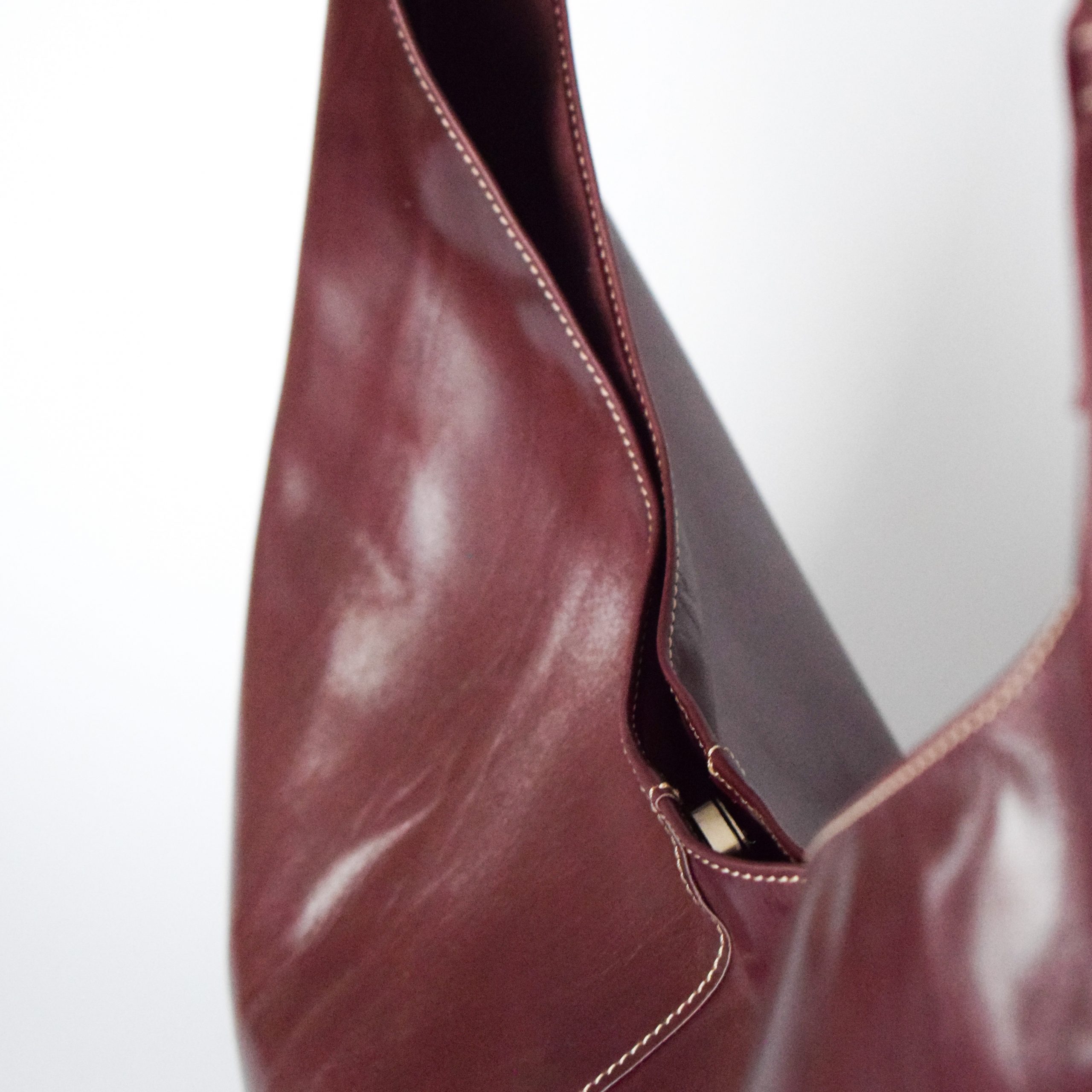 Découvrez Mona, un sac en cuir bordeaux vernis, élégant et pratique, entièrement réalisé à la main dans mon atelier à Aigues-Vives, dans le Gard.