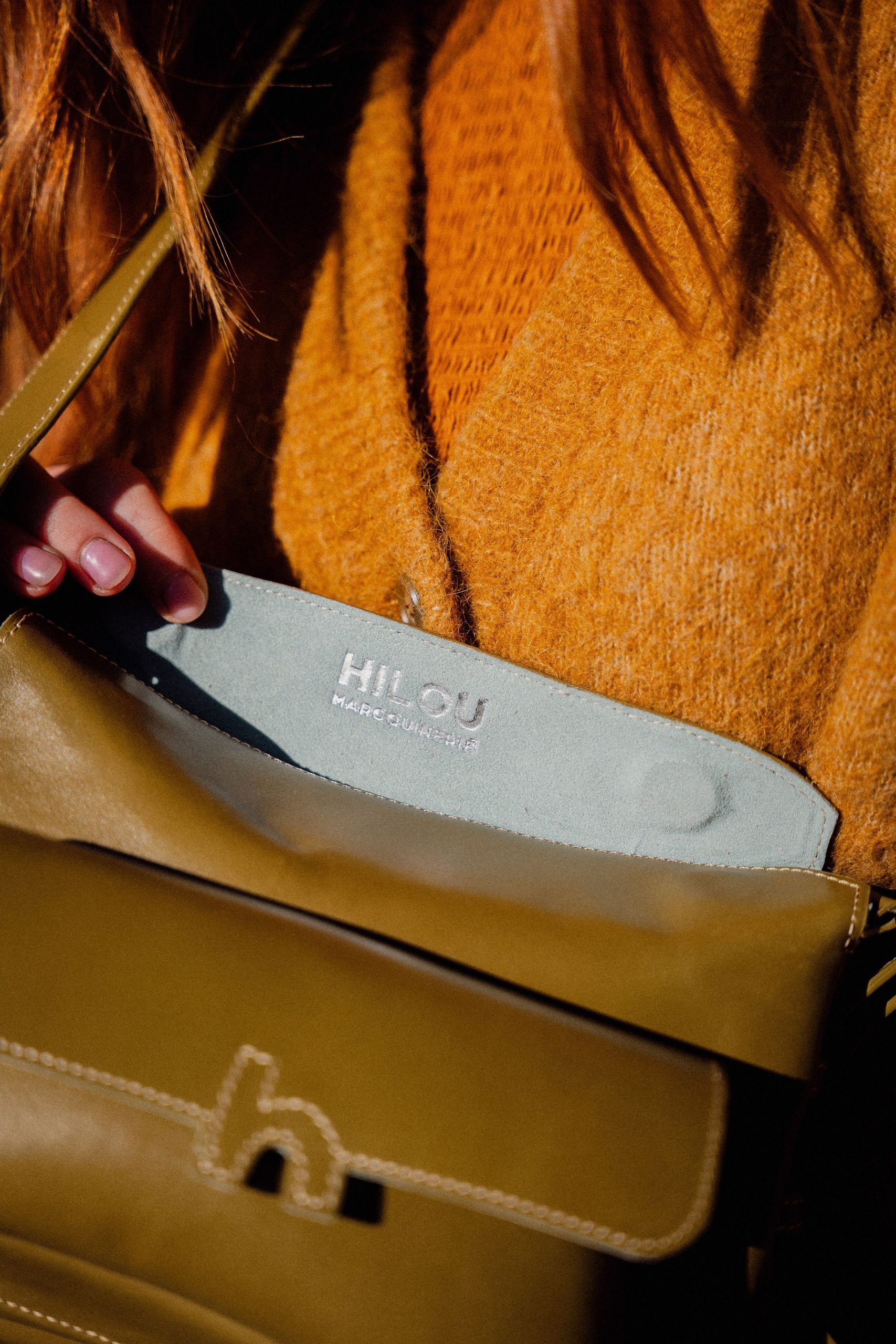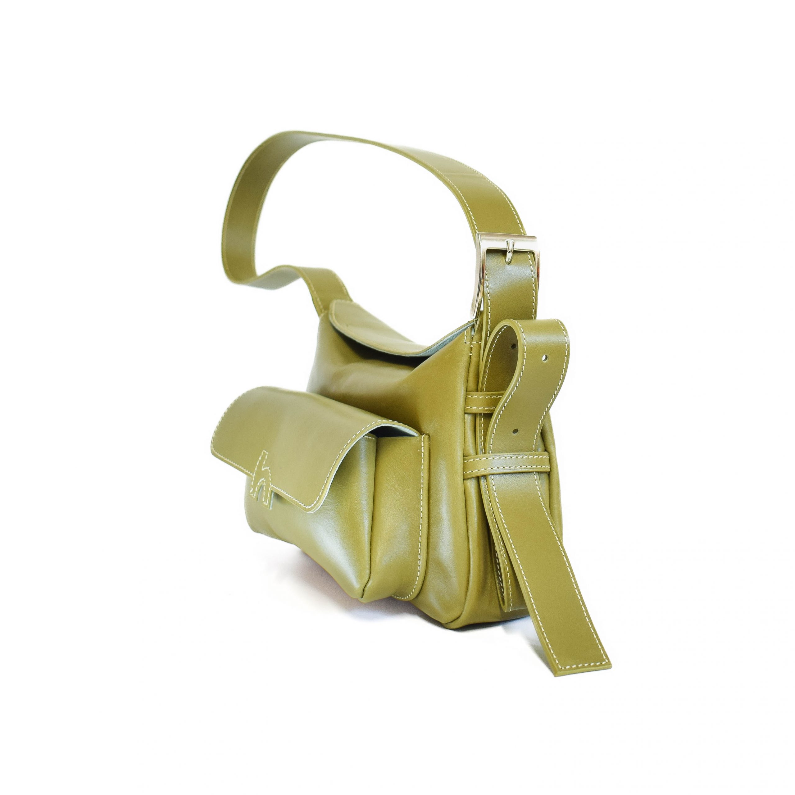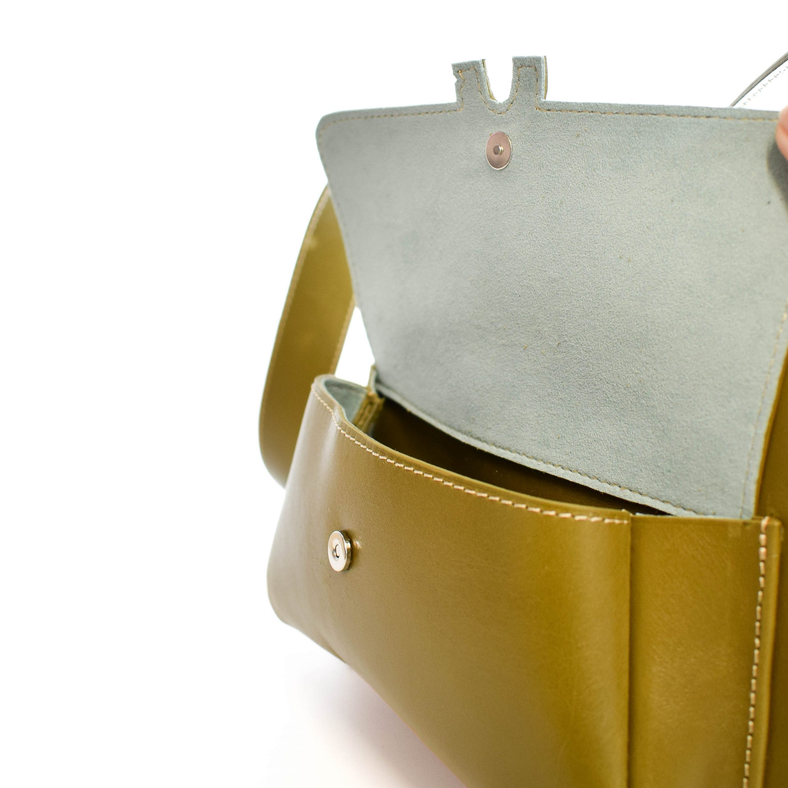 Sac en cuir kaki au design épuré, fabriqué à la main en France. Pratique et élégant, il se porte à l’épaule ou en bandoulière avec ses poches fonctionnelles et sa doublure en alcantara bleu gris.