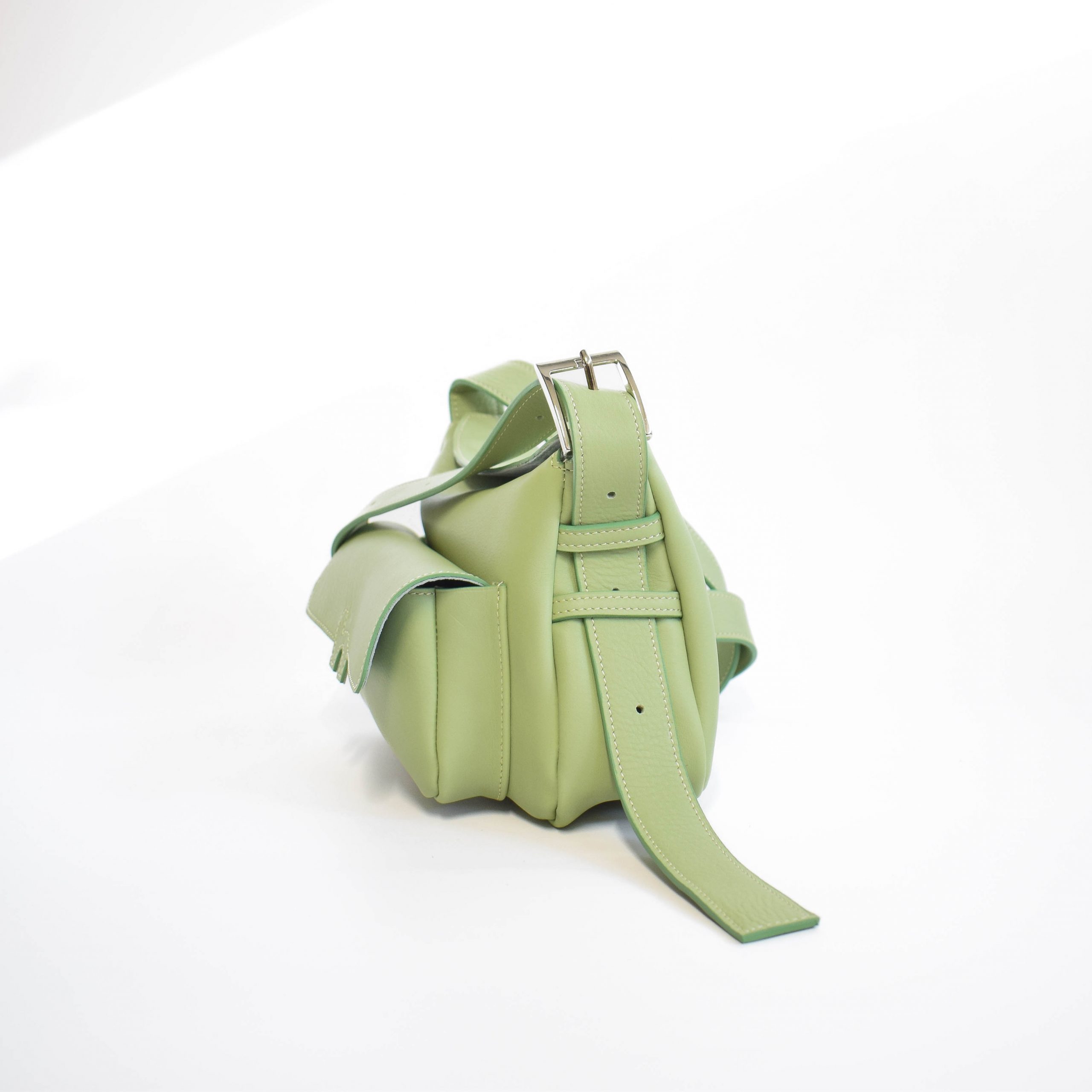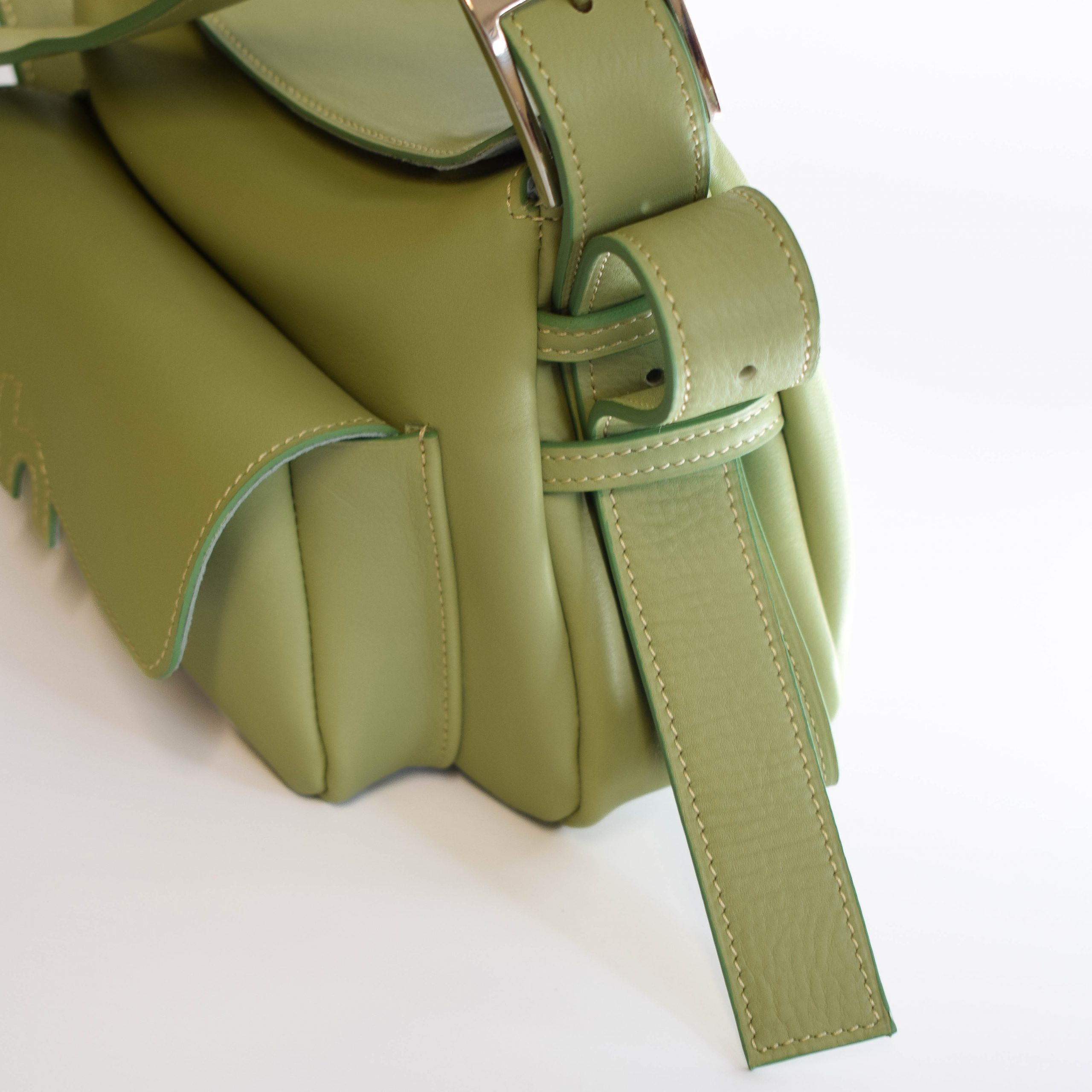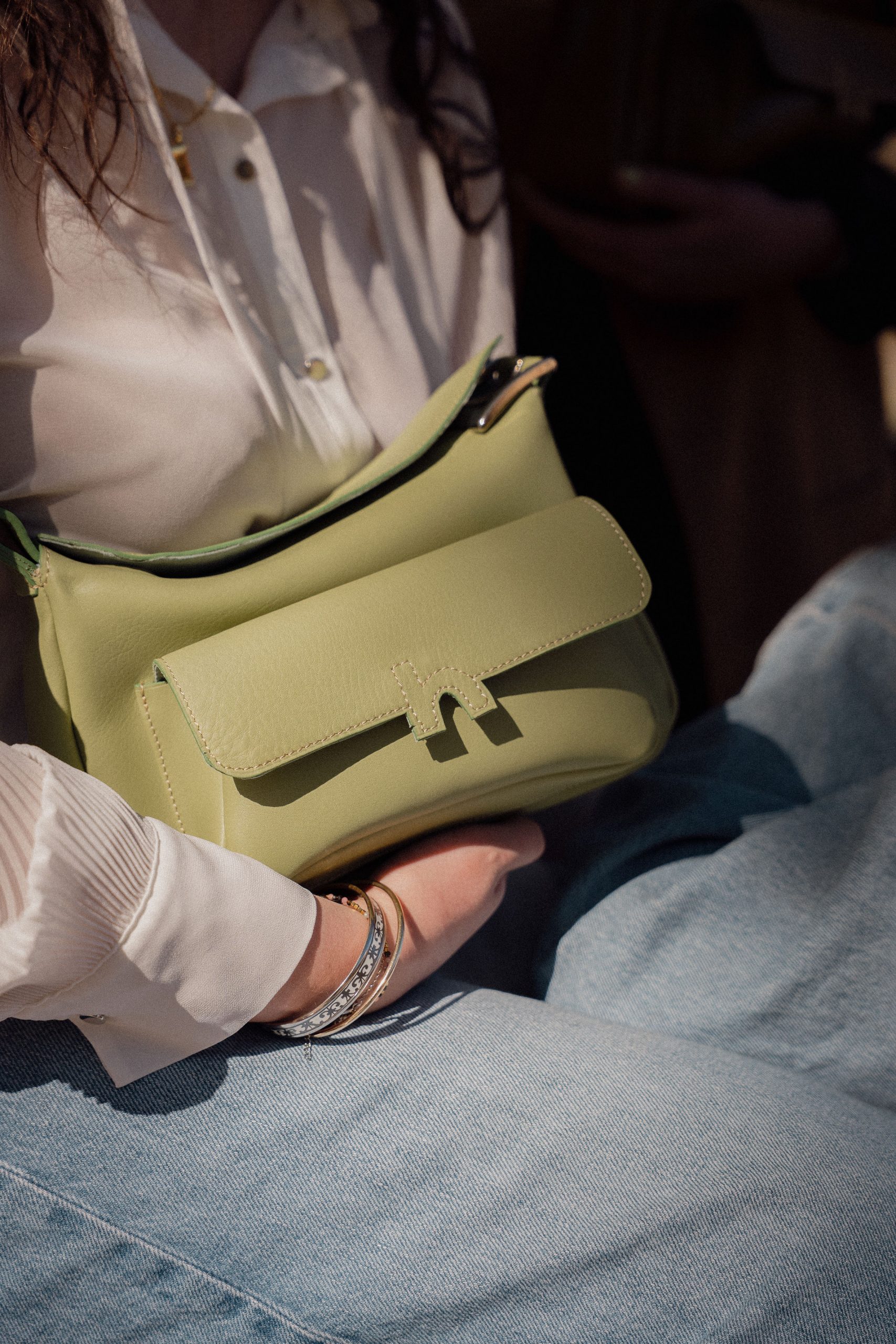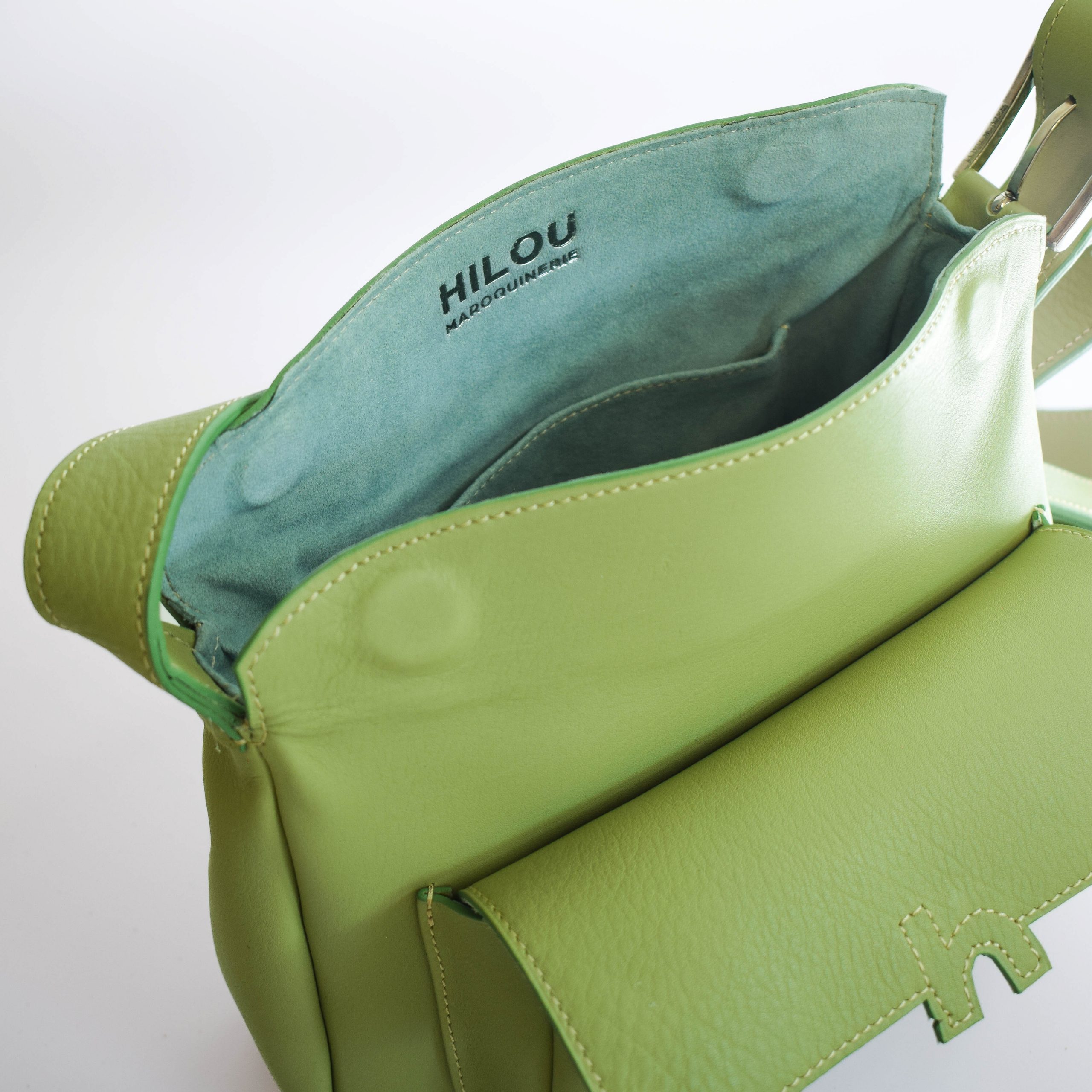 Sac en cuir vert au design épuré, fabriqué à la main en France. Pratique et élégant, il se porte à l’épaule ou en bandoulière avec ses poches fonctionnelles et sa doublure en alcantara bleu gris.
